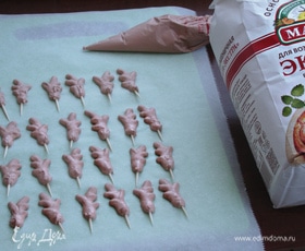 На бумаге для выпечки нарисовать мордочки и рожки, в рожки вставить маленькие шпажки. Все эти «запчасти» поставить в разогретую до 70°C духовку и подсушить минут 15.
