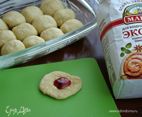 Подошедшее во второй раз тесто разделить на равные 12–15 частей. Сформировать булочки, при желании в середину каждой добавить джем (у меня клюквенный), уложить в смазанную сливочным маслом форму. Накрыть салфеткой и поставить в теплое место минут на 15. Подошедшие булочки можно смазать яйцом (я смазала обычным молоком).