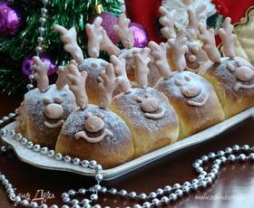 Благодаря муке «Экстра» бренда MAKFA булочки получаются воздушные и очень нежные. Они уже готовы. Но у нас же скоро Новый год, поэтому наступает самое увлекательное занятие — украшение. Для этого оставшимся айсингом рисуем глазки, ротики, закрепляем носики. Установить рожки и посыпать сахарной пудрой. Я думаю, что с такой интересной и увлекательной задачей вполне справятся детки.