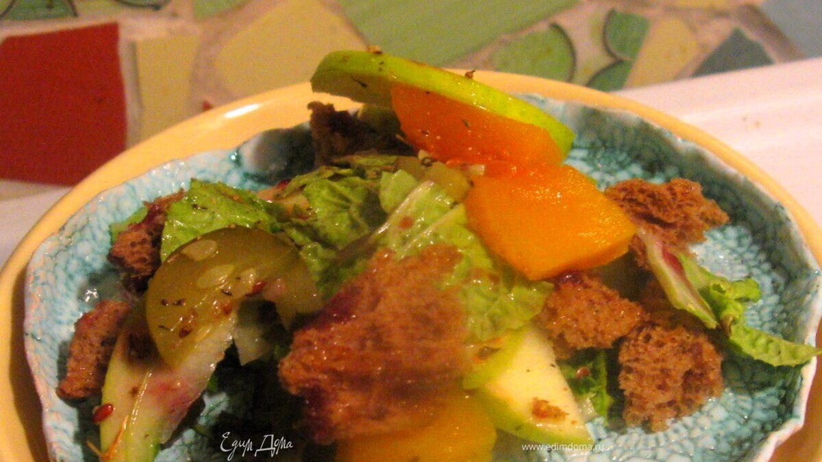 Лучше маринованную тыкву подогревать отдельно непосредственно перед подачей. Нарвать салат руками, яблоки нарезать как можно тоньше. - Шаг 3