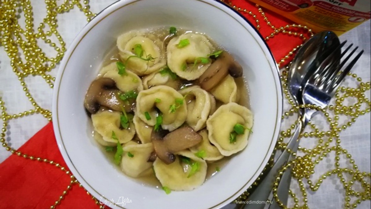Отвариваем тортеллини в кипящей воде или в бульоне. Я добавила замороженные шампиньоны в бульон для аромата. После того, как тортеллини всплывут на поверхность, варим еще 3–4 минуты. Подаем тортеллини с бульоном, посыпав зеленым луком. - Шаг 12