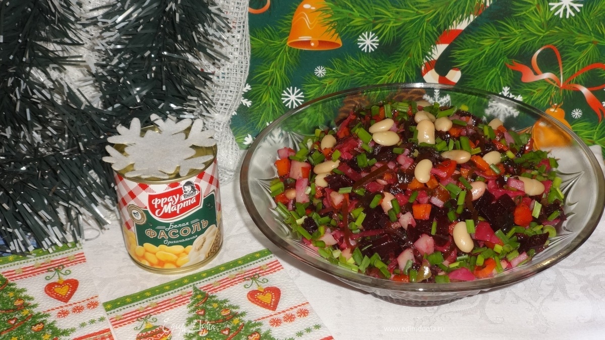 Во многих семьях винегрет, наряду с салатом оливье, является традиционным новогодним блюдом. Наша семья не исключение. Существует множество рецептов винегрета. Я люблю экспериментировать с этим блюдом: добавляю или убираю какой-нибудь из компонентов, использую разные виды капусты, бобовых, различные специи. В результате каждый раз получается блюдо с новым вкусом. В моем сегодняшнем варианте винегрета два вида капусты — маринованная морская капуста и домашняя маринованная белокочанная капуста со свеклой. Зеленый горошек я кладу редко, мне больше нравится фасоль. Я взяла для винегрета вкусную консервированную фасоль ТМ «Фрау Марта». Угощайтесь! Очень вкусно!