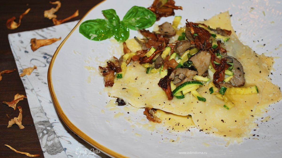 Домашная паста, приготовленная и сразу сваренная, хороша в любом виде и с разной начинкой. Такую еду в нашей семье могут есть каждый день. Готовить бысто и просто, а начинка может быть любая — кому какая нравится. Я приготовила с белыми грибами, лисичками и цукини.