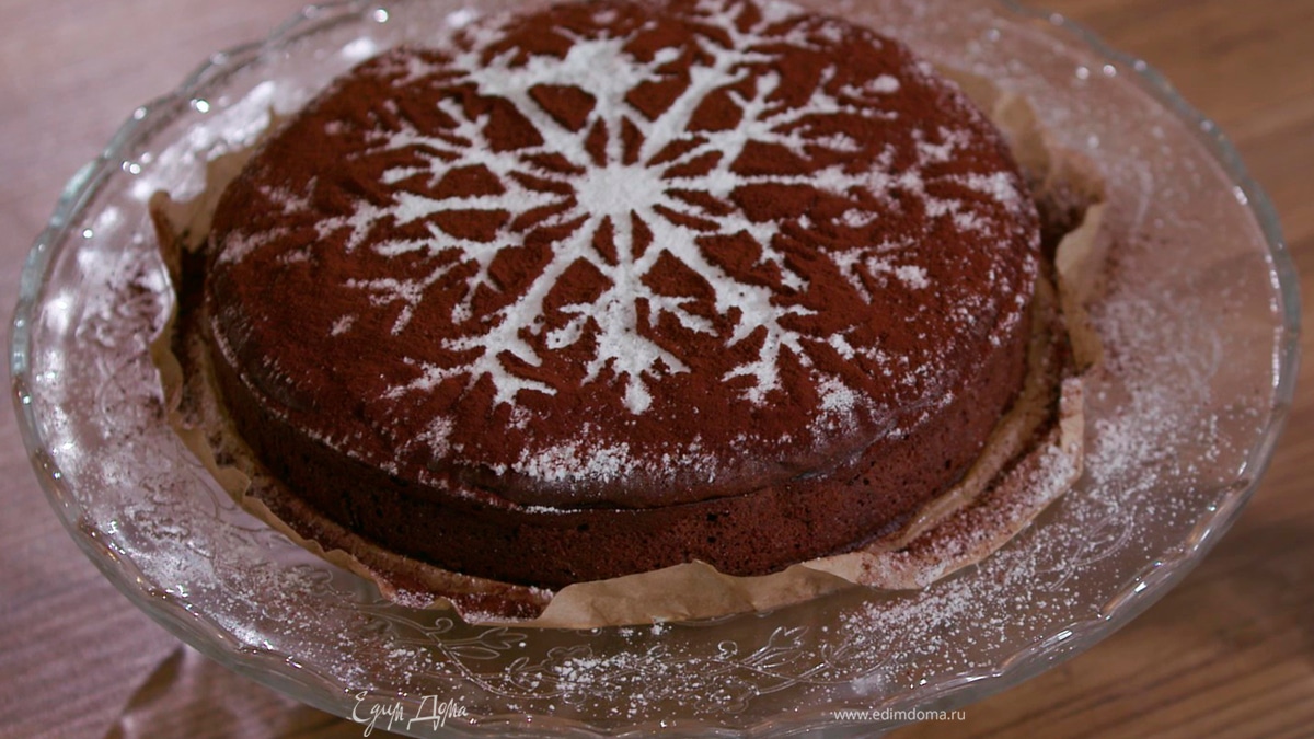 Используя любой трафарет, например в виде снежинки, посыпать теплый пирог оставшейся сахарной пудрой и какао.