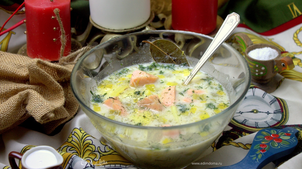 Мой свекор после любых походов в гости просил дома у жены супчик. После домашних праздников тоже. Такой суп вполне можно назвать праздничным и подать на торжественный обед. Я не варю супы огромными кастрюлями на неделю впрок, но супы у нас бывают часто. Поэтому использую варианты без долгой варки, но чтобы домашние при этом остались сытыми. Этот суп втихаря поел мой младший сын (который не ест принципиально рыбные супы, ему даже запах не нравится!), хотя я не предлагала. Пришел и сказал: «Очень вкусный супчик!» Я чуть со стула не упала, но не подала виду. Последнюю порцию из главного фото почти что украли, поэтому торопилась. Буду варить еще. Рецепт от шеф-повара Юрки Тсутсунен, только я заменила репчатый лук на порей и не стала в конце добавлять кусок масла.
