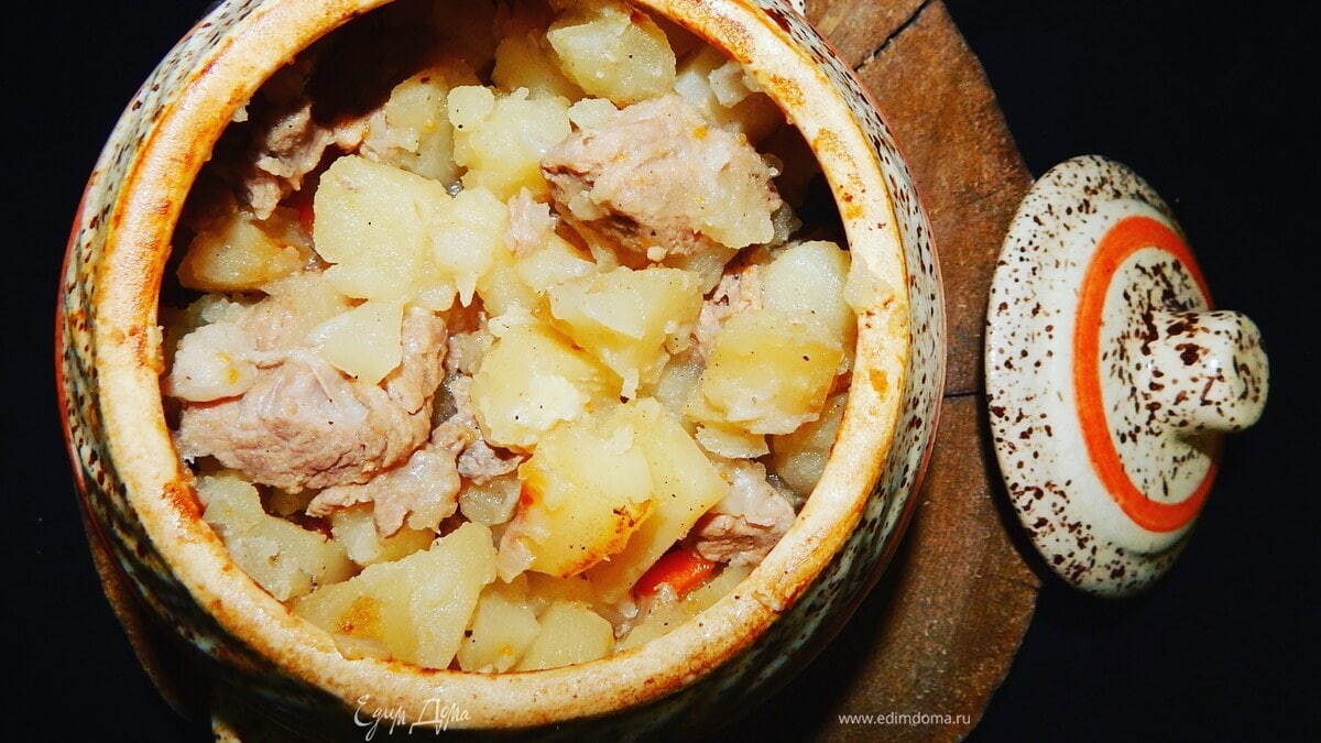 зачем варить мясо? муж чуть его обжаривает,как все составляющие и закладывает в горшки,пусть жирок останется в картошке,все будет готово,не сомневайтесь! А еще его ноу хау-сыпет чуть бульона Ролтон(кто любит) и полстакана воды льет,а сверху ложку сметаны)) Супер!