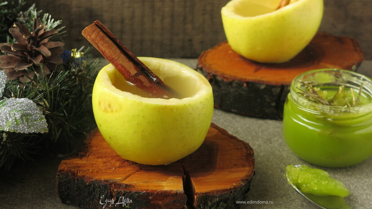 Ароматный напиток с пряностями в бокалах из яблок. Пряности согревающие, зимние: корица, имбирь и гвоздика. Фруктовую компоновку можно менять по вкусу, главное — яблоки. Рекомендую выбирать кислые твердые сорта. Приятного аппетита!