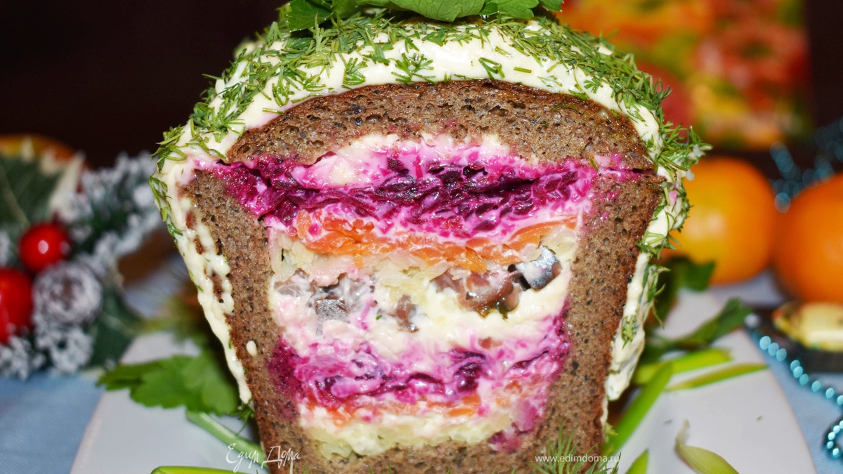 Селедка под шубой в бородинском хлебе готова. Приятного аппетита! С наступающим Новым годом!