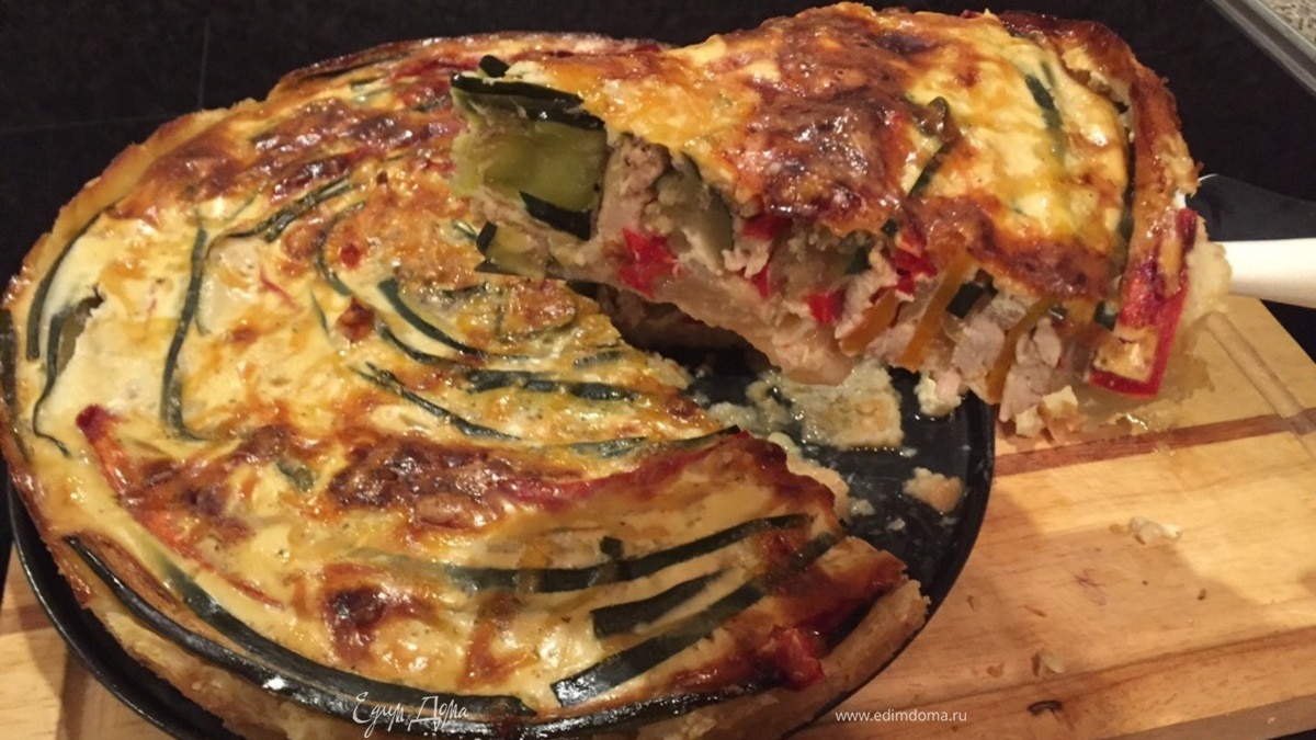 Далее выкладываем овощи и грудку поочередно внахлест по кругу. Перед тем, как поместить пирог в духовку, делаем заливку. Для этого смешиваем 2 яйца и сливки, немного солим, перчим по вкусу. И заливаем пирог. Помещаем в разогретую до 180°C духовку на 45 минут. - Шаг 3