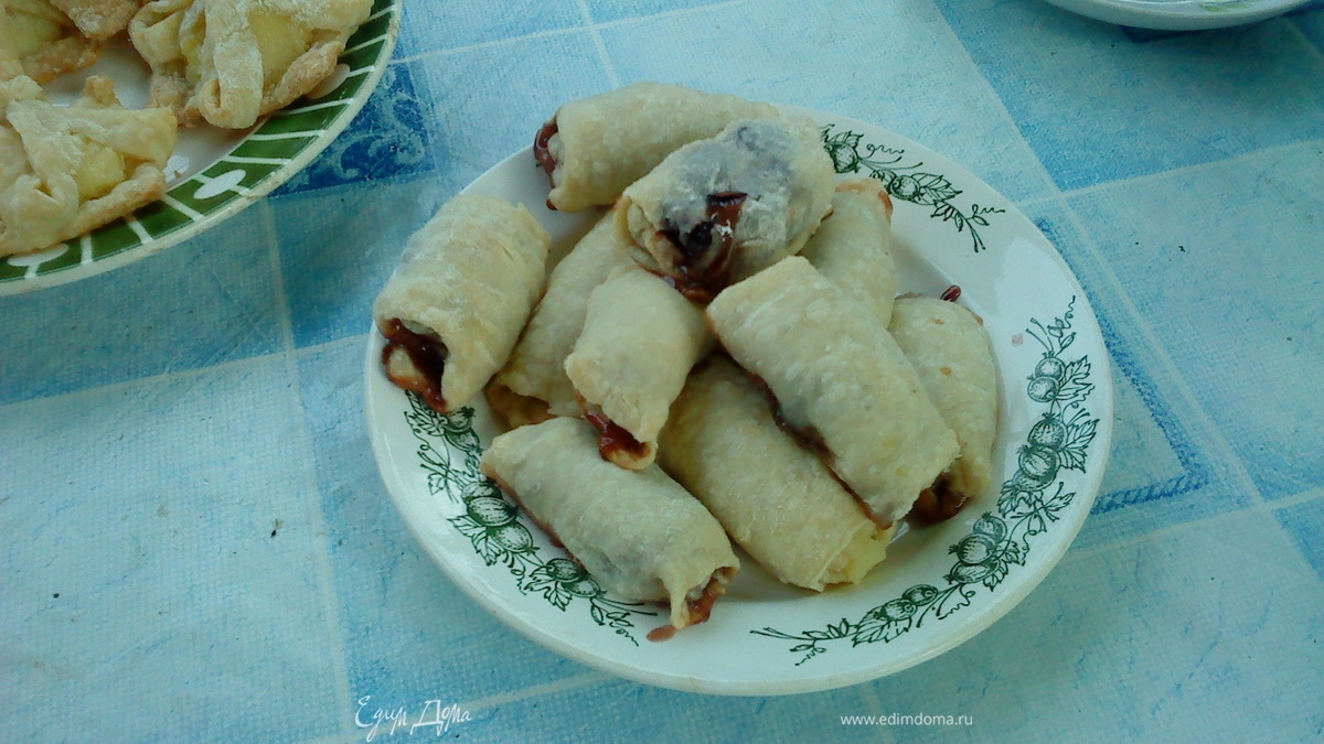 - Шаг 1Тесто раскатать,разрезать на прямоугольные полоски,выложить варенье и свернуть в трубочку,края защипить.Выпекать на смазанном маслом протвине до готовности.