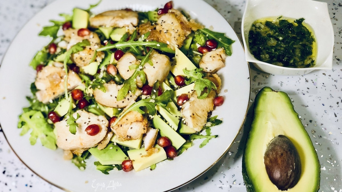 Выкладываем на большую широкую тарелку листья руколы, киноа, авокадо (нарезать кубиком).
