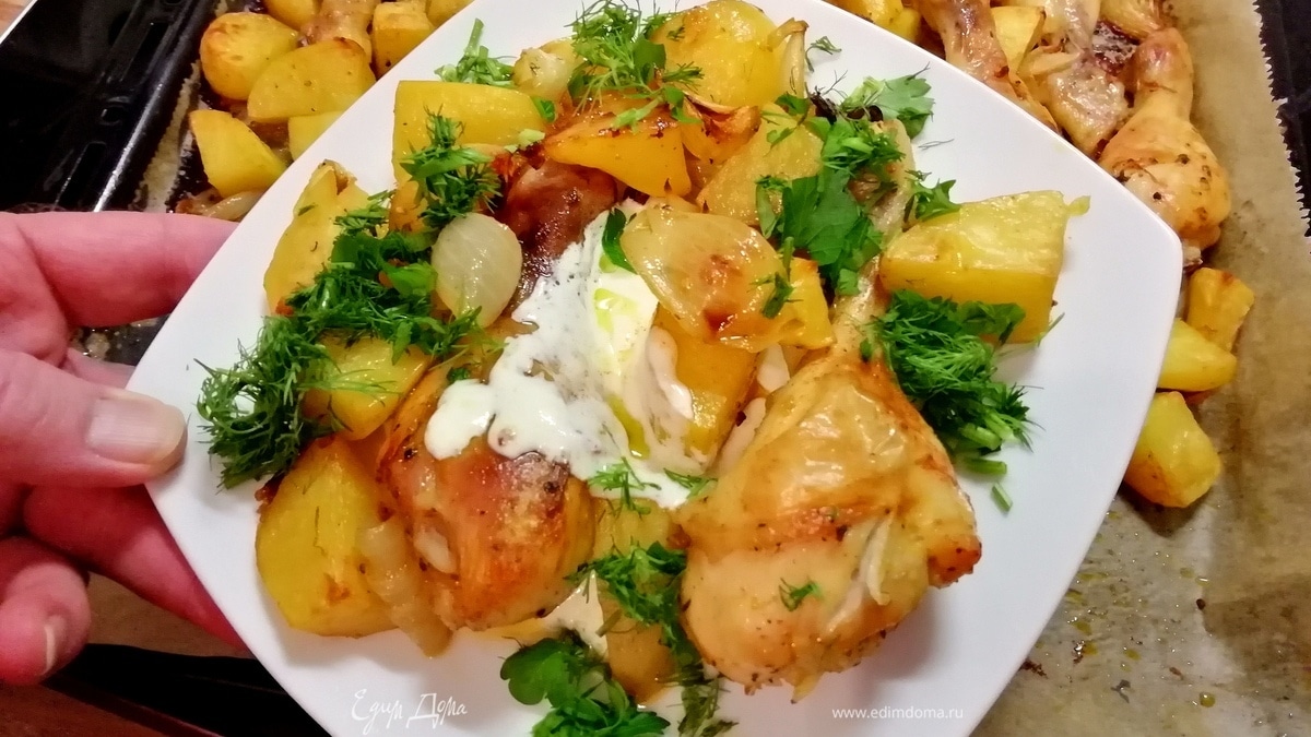 Духовку разогрейте до 200°C. Переложите продукты в форму для запекания или прямо на противень, покрытый пергаментной бумагой, и запекайте до готовности мяса. Через минут 20 следует аккуратно перевернуть кусочки курицы и картофеля на другую сторону, чтобы они равномерно прожарились.