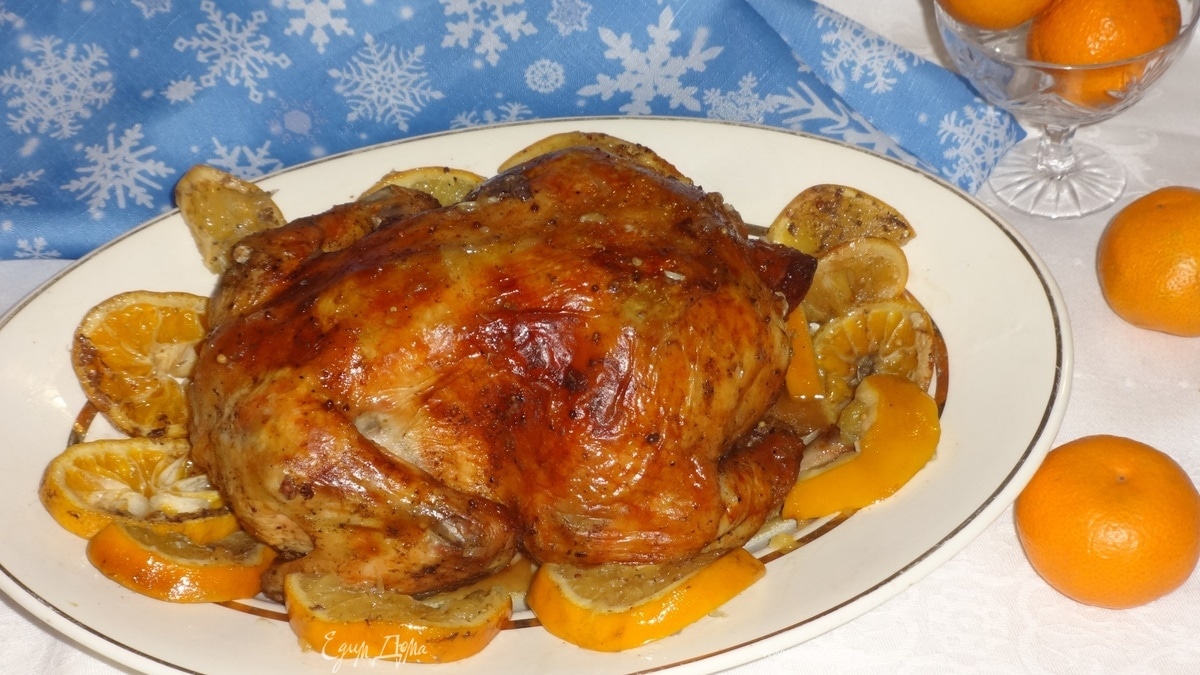 Новый год всегда ассоциируется с запахом хвои и мандаринов. Предлагаю приготовить на праздничный новогодний стол запеченную курицу, начиненную мандаринами и апельсинами. Предварительно курица маринуется в смеси сметаны, горчицы и специй. Курочка получается очень вкусной,