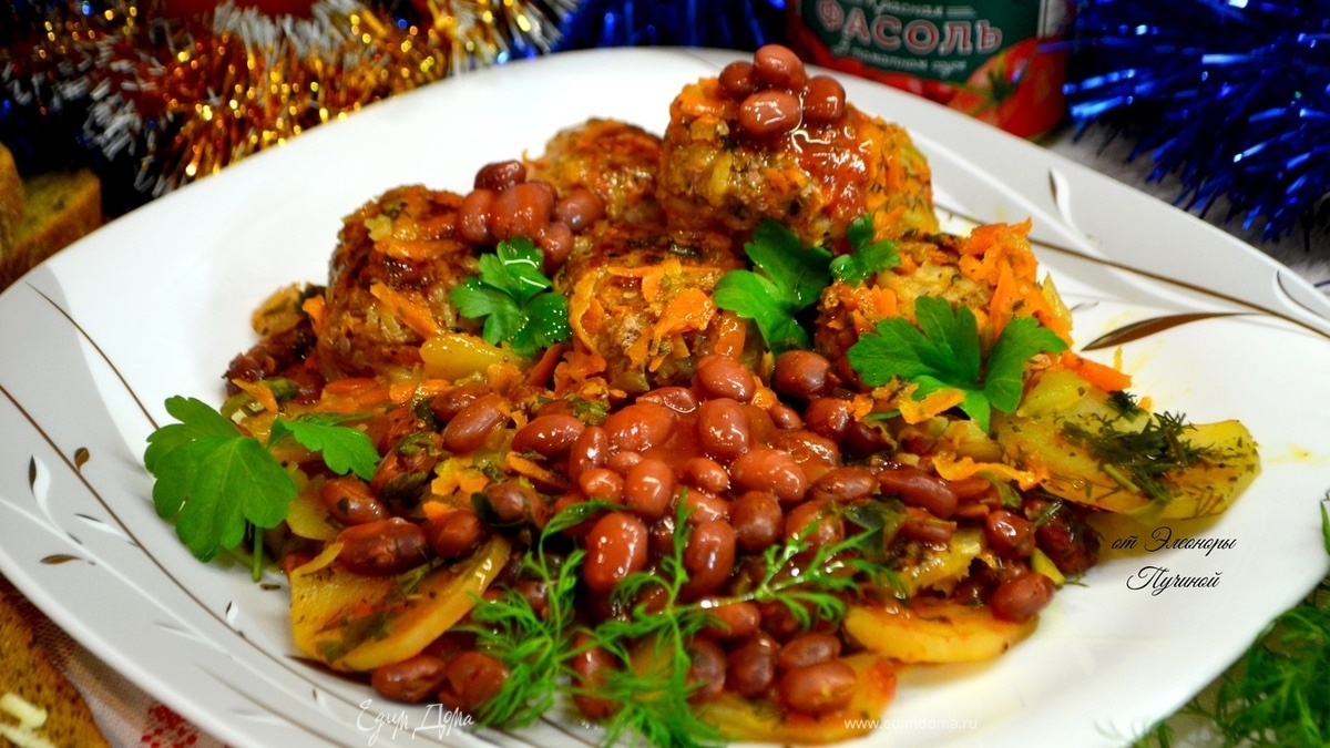 Слоями на блюдо выложить картошку с овощами, сверху — тефтели, фасоль и зелень. - Шаг 8