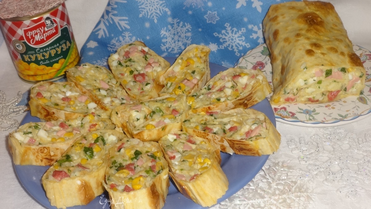 Предлагаю вашему вниманию вкусную горячую закуску из лаваша, начиненного кукурузно-рисовым салатом. Ее можно приготовить заранее и держать в холодильнике, а непосредственно перед подачей запечь в духовке. Для приготовления блюда я использовала сладкую консервированную кукурузу ТМ «Фрау Марта». Такая закуска будет красиво смотреться на праздничном новогоднем столе.