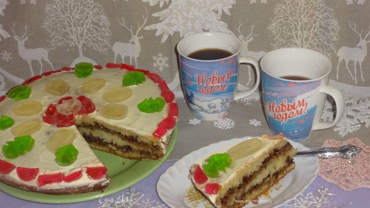 Верх манника смазать густой жирной сметаной. Сахара в сметану я не добавляла, так как достаточно сладко. Верх я украсила разноцветным мармеладом. Я хотела сохранить «дух того времени», поэтому мой праздничный вариант очень минималистичен. Я представила, что так пирог украсила бы моя бабушка. - Шаг 13