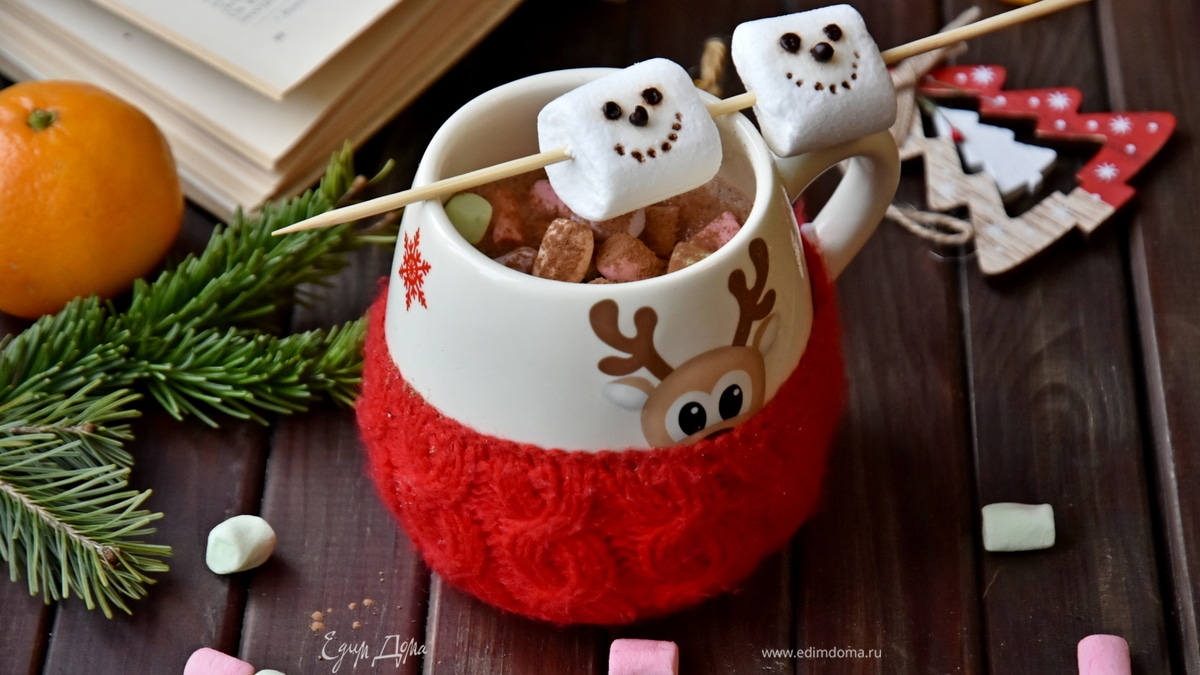 Перелить горячий шоколад в бокал. Украсить маршмеллоу мини. Сверху маршмеллоу можно посыпать щепоткой како-прошка.