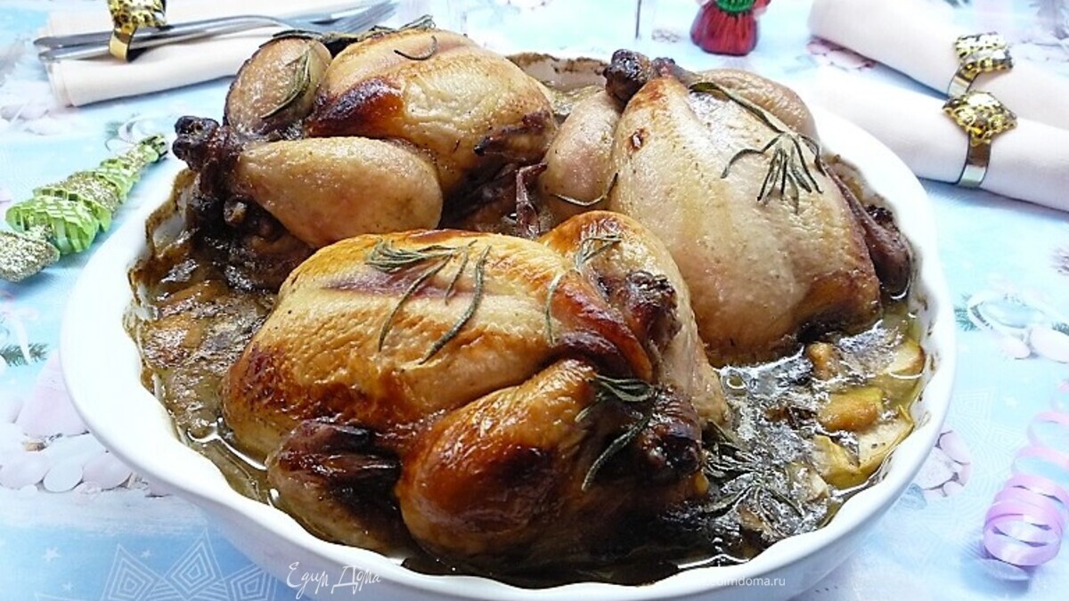 Укладываем цыплят на фрукты, поливаем соусом и посыпаем сверху розмарином. Запекаем в заранее разогретой духовке при температуре 180°C