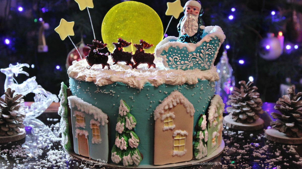Красивый и вкусный торт — это кульминация праздника. Торт является запоминающимся блюдом, которое будет ассоциироваться с новогодним застольем. Данный торт приготовлен с добавлением шампанского, чем приятно удивит всех гостей своим приятным ароматом и бархатным послевкусием. Уверена, что все попросят еще добавки и каждому захочется похрустеть карамельной луной, частью ароматного имбирного домика или попробовать на вкус сани Деда Мороза.