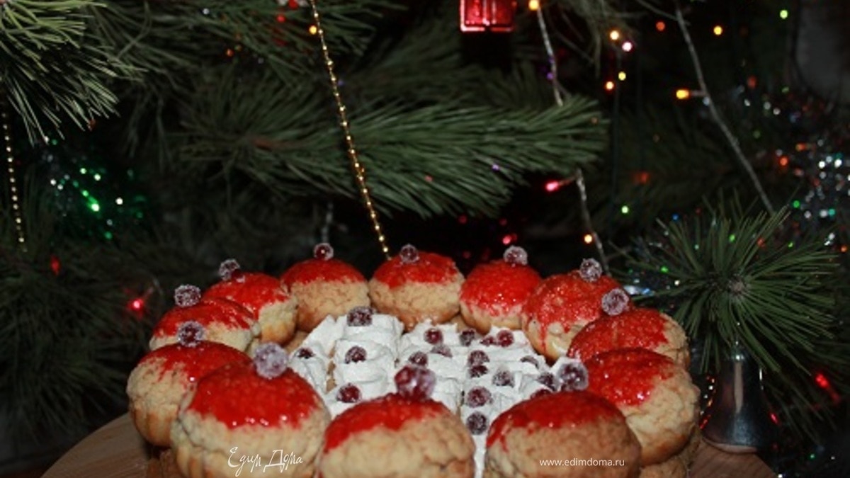 На карамели закрепить заварной корж с кракелином. Сверху по окружности выложить профитроли, окуная их в горячую карамель. Верхушки украсить клюквой в «снегу». - Шаг 35