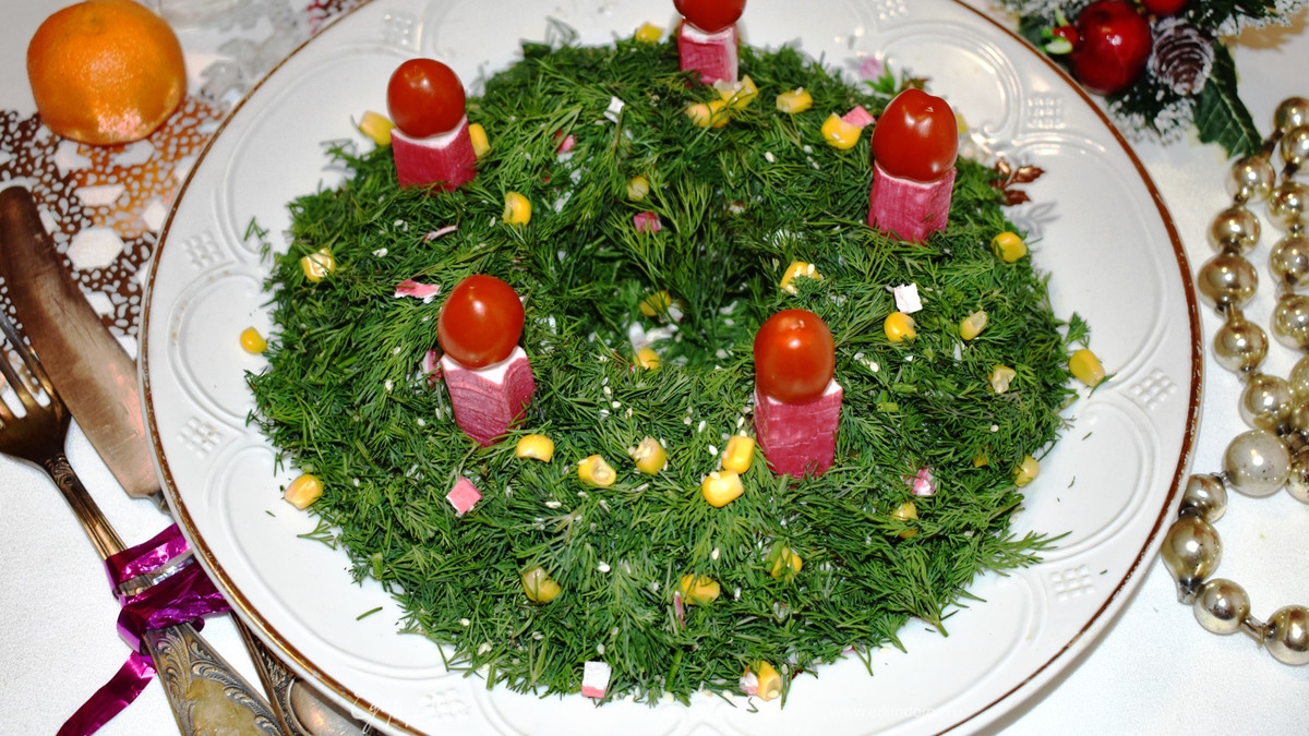 Новогодний салат из крабовых палочек с консервированной кукурузой готов. Приятного аппетита! Угощайте гостей!