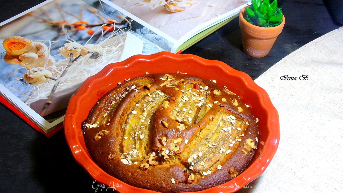 Всыпать в смесь и перемешать. Выложить в смазанную маслом форму, сверху выкладываем порезанные бананы. Сверху присыпаем или овсяными хлопьями, или же коричневым сахаром, очень хорошо подойдут миндальные лепестки. Это уже на ваш вкус. - Шаг 5