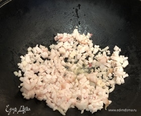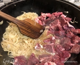 Немного обжарьте лук и добавьте кусочки баранины. Обжарьте до румяной корочки.