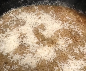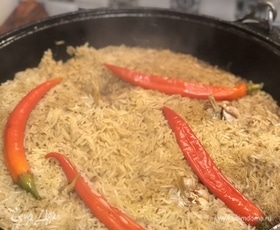 Вскипятите 1,5 литра воды и аккуратно влейте в казан. Не выливайте всю воду сразу. Вода должна покрывать рис на 1 см. Если вся вода впиталась, а рис еще не готов, добавьте еще немного воды.
