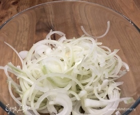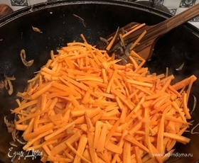 Нарежьте морковь брусочками и добавьте к луку и мясу.