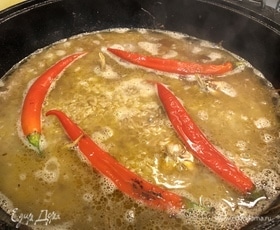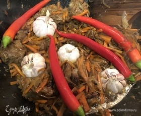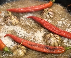 Выложите очищенный от шелухи чеснок и перец чили. Перец не даст остроту блюду. При желании перец можно выдавить в готовый плов.