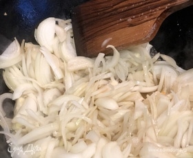 Когда жир полностью вытопится, достать шкварки из казана. Выложить предварительно нарезанный полукольцами лук.