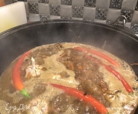 Вскипятите воду и вылейте в казан. Вода должна покрывать содержимое на 2 сантиметра. Добавьте соль. Бульон должен быть немного пересолен. Рис потом впитает в себя лишнюю соль.