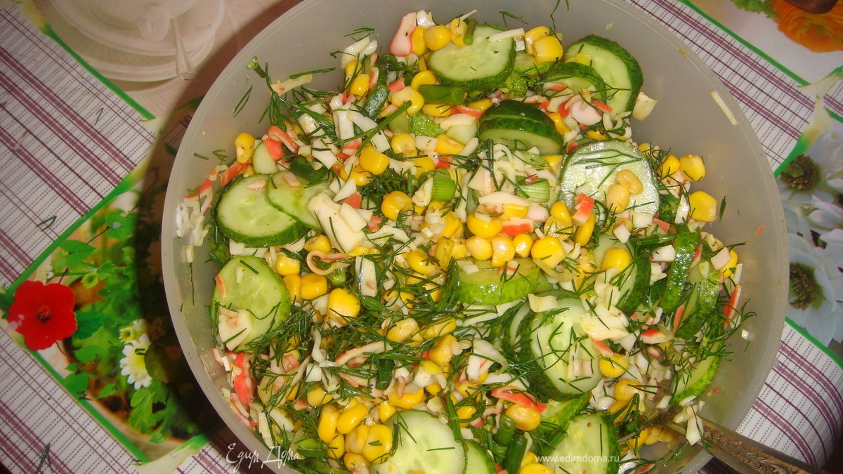- Шаг 1Нарезать крабовые палочки, огурцы, вареные яйца, высыпать кукурузу. Заправить карри, посолить, украсить зеленью.