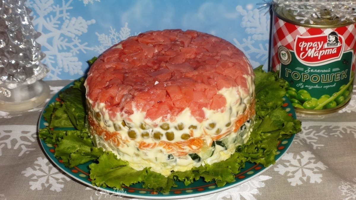 Слоеные салаты любят многие хозяйки. Здесь открывается большой простор для фантазии, ведь для таких салатов можно использовать большой перечень продуктов. Главное, чтобы в салате гармонично сочетались разные вкусы. Сегодня я предлагаю такой слоеный салатик из слабосоленой красной рыбы, моркови по-корейски, консервированного зеленого горошка ТМ «Фрау Марта», свежего огурчика и вареных яиц. Салат получился нежным и вкусным, всем родным понравился. Хорошо подойдет для праздничного стола. Готовьте и угощайтесь!