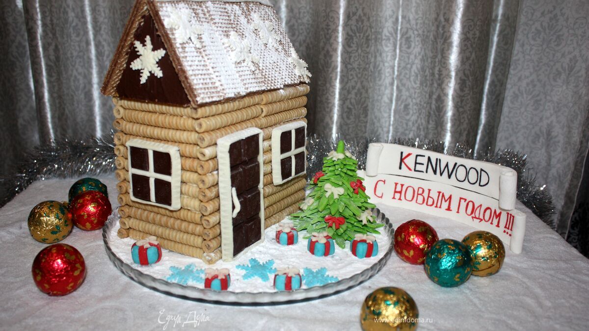 Предлагаю новогодний вариант подачи торта. Такой домик отлично украсит любой стол и придаст ему более интересный и праздничный вид.