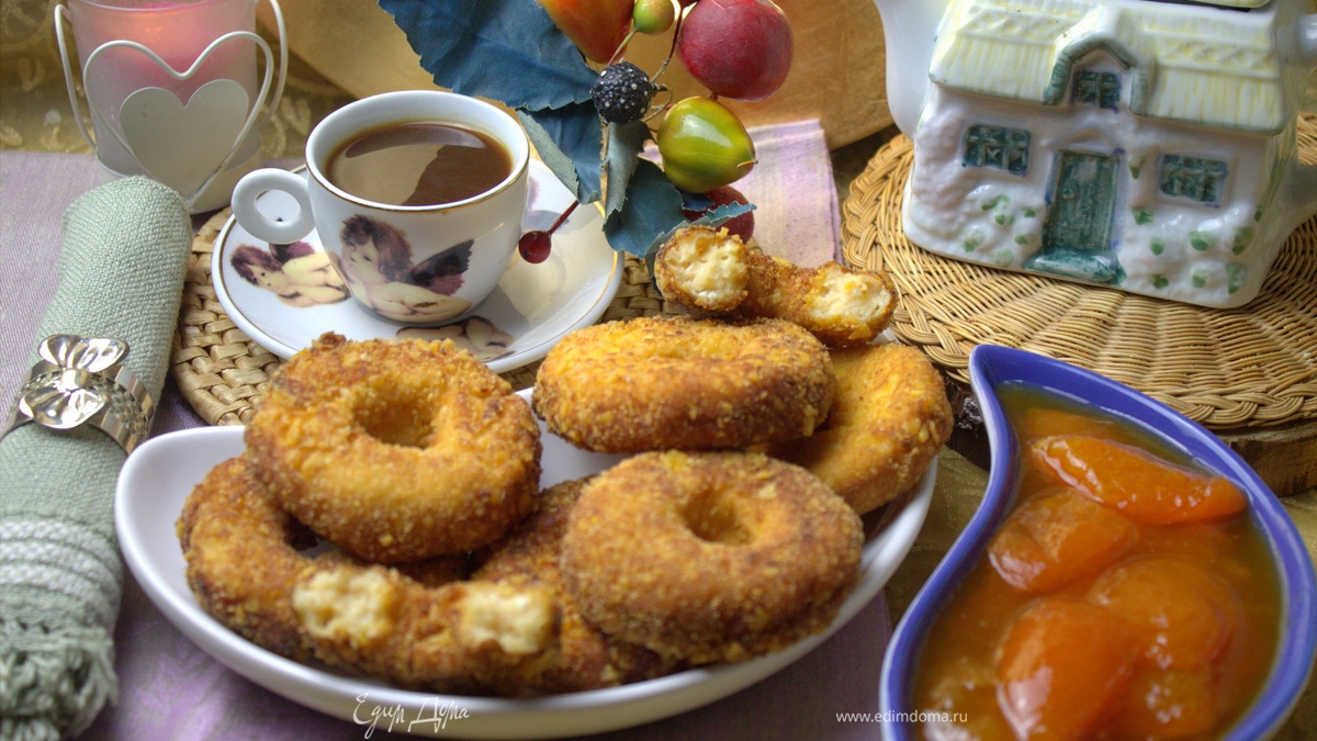 Сырники — традиционный завтрак в нашей семье в выходные дни и не только. Сегодня получились сырники а-ля пончики. Немного заморочисто, но идеально для праздничного завтрака. Семьи-любители творога оценят. Летом варенье можно заменить свежей клубникой. За идею спасибо Софии. Кружочек посередине делаем, чтобы прожарился центр, благодаря этому сырник недолго проводит время в масле.
