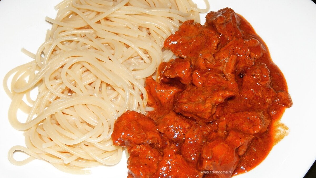 Сервируйте спагетти с мясом, можно посыпать зеленью перед подачей. Приятного аппетита!