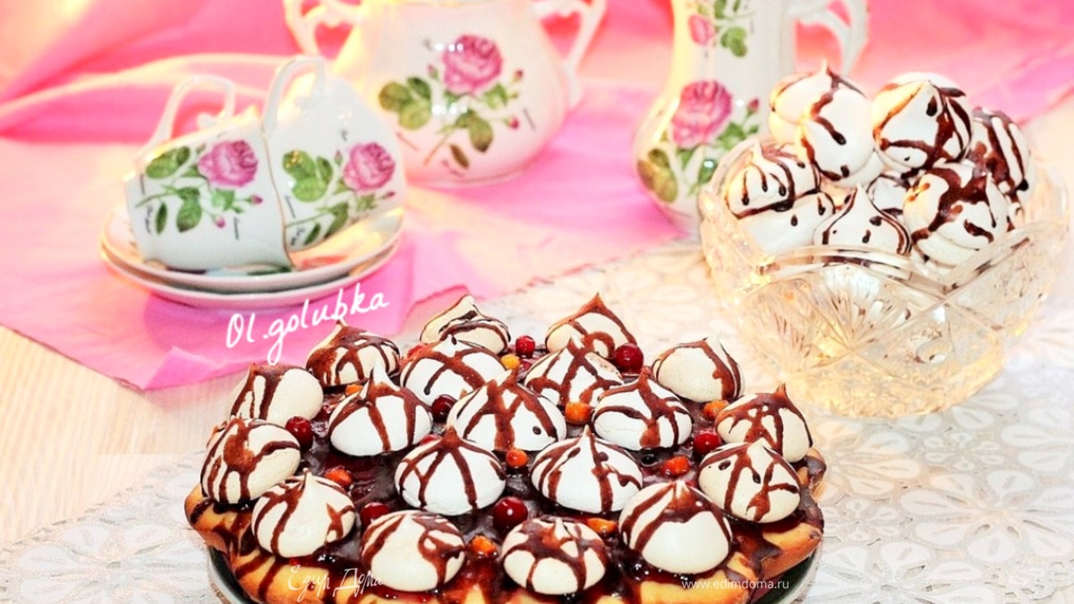 Готовый корж немного остудить, извлечь из формы и сразу же смазать джемом. Дать джему немного застыть и уложить сверху безе. Укладывать безе можно горкой или как на фото. Если вы хотите приготовить торт, тогда разрезаете пирог на 2 части, пропитываете сиропом, затем смазываете коржи джемом. - Шаг 8