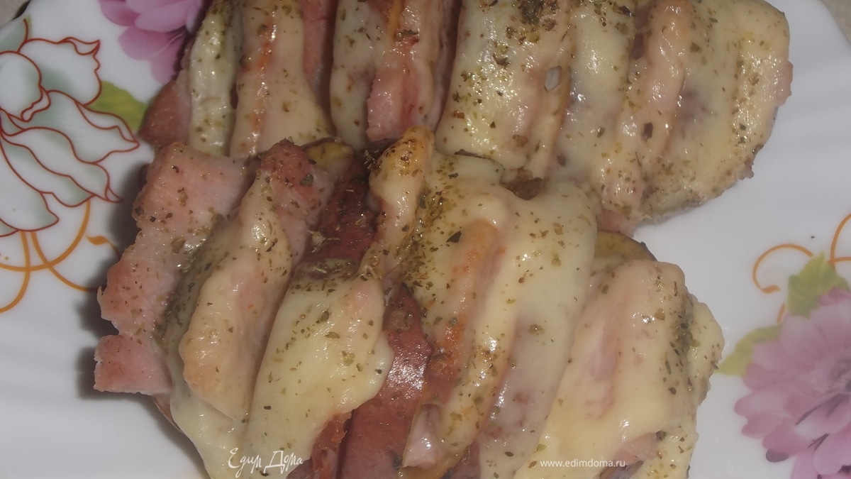 Картошку хорошо вымыть. Сделать надрезы гармошкой толщиной 0,5 см. В каждый надрез уложить кусочек грудинки. Выложить подготовленный картофель в форму для запекания, посолить, смазать растительным маслом. - Шаг 2