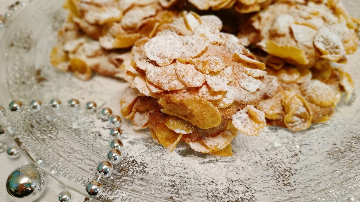Готовить печенье очень быстро, а результат порадует всю семью. Самое главное в печенье — это кукурузные хлопья и изюм, орехи можно взять любые, а можно и без орехов, вкус можно корректировать. Печенье получается очень вкусное, не жесткое, а хлопья придают пикантный хруст. Это печенье готовят в Италии и угощают им своих друзей и близких на праздники и не только.