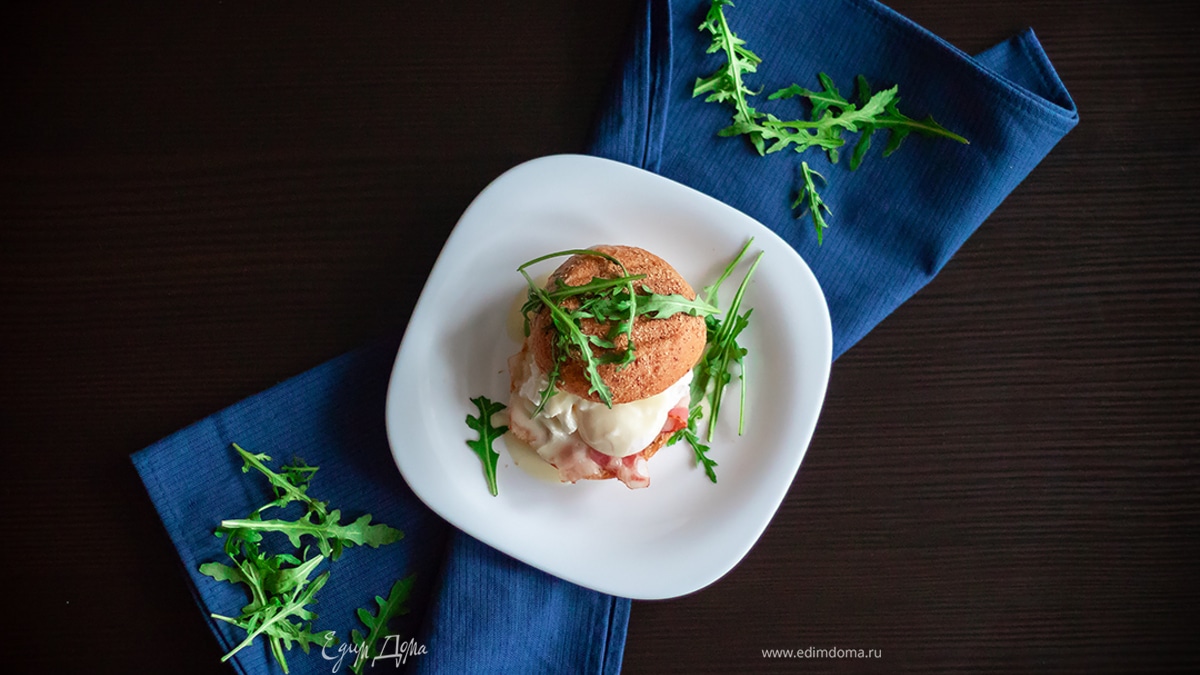Это блюдо состоит из булочки, бекона, голландского соуса и яйца пашот. Все это у нас имеется в наличии. - Шаг 2