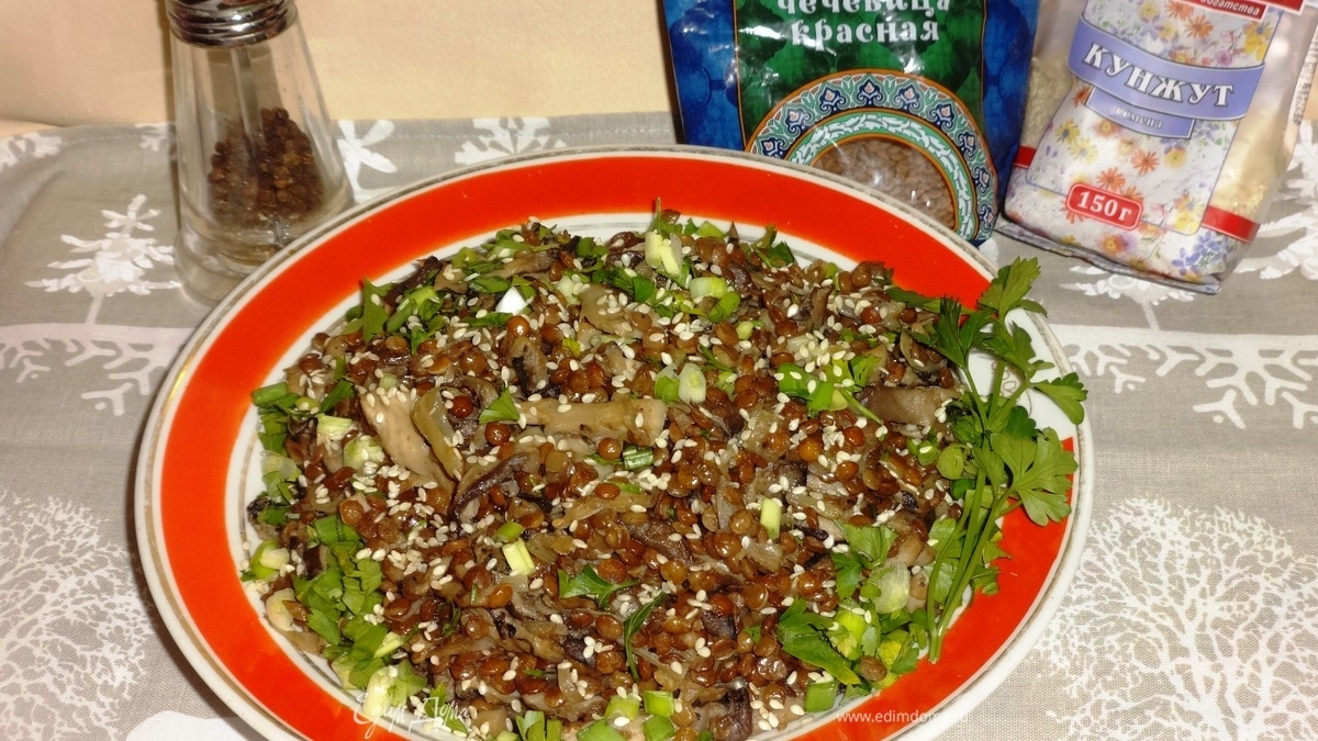 Теплые салаты очень популярны и в европейской, и в азиатской кухне. Они могут быть завтраком, обеденным перекусом, ужином. Теплый салат самодостаточен, к нему не нужно подавать гарнир. В теплых салатах для заправки обычно используются растительное масло, специи, бальзамический уксус, соки лимона или лайма. Никогда теплый салат не заправляют майонезом, сметаной и другими жирными соусами. Предлагаю вашему вниманию теплый салат из грибов и чечевицы. Чечевица очень полезна для организма благодаря своему богатому витаминно-минеральному составу. Я взяла для своего салата вкусную красную чечевицу и семена кунжута ТМ «Националь». Салат отлично подойдет для рождественского поста. Да и в другие праздничные и будние дни он будет полезен. Угощайтесь, это очень вкусно!