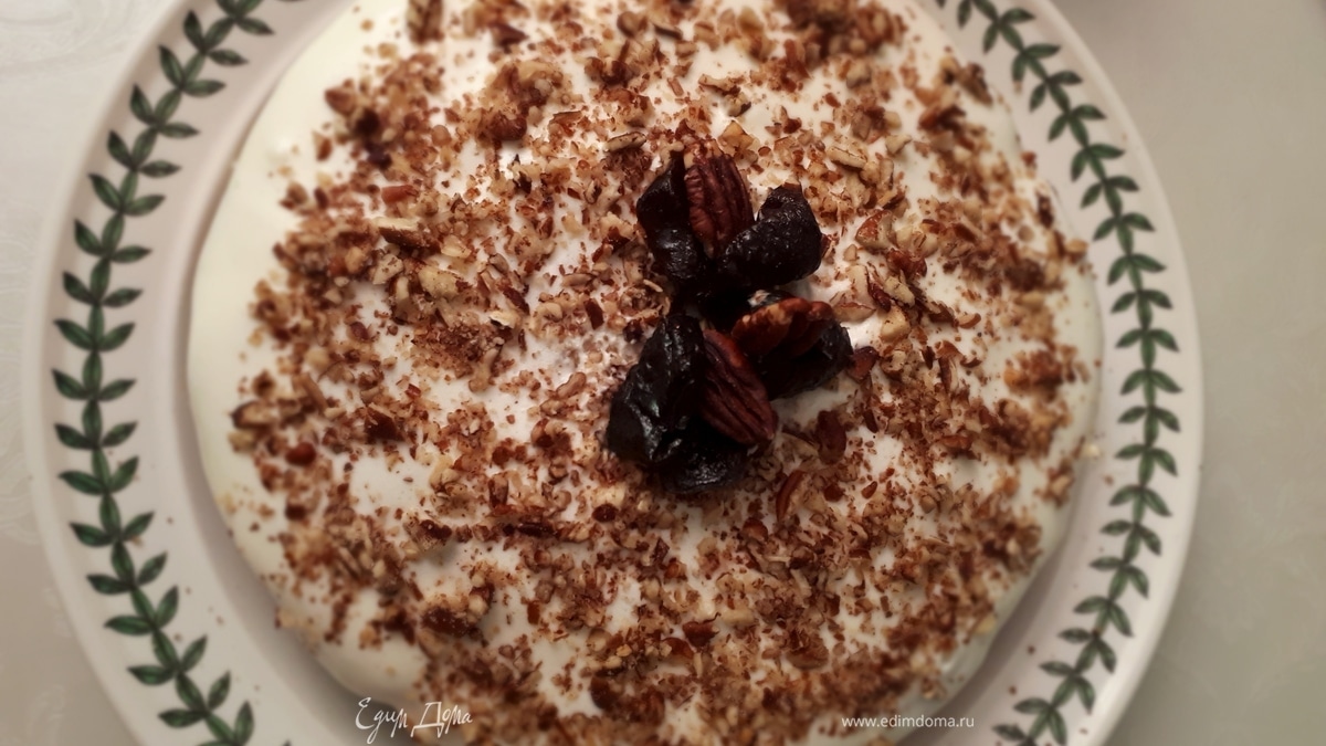 Сборка: соединить две половинки кремом внутрь. Оставшимся кремом полить сверху торт и посыпать по желанию грецким орехом, украсить черносливом. - Шаг 13