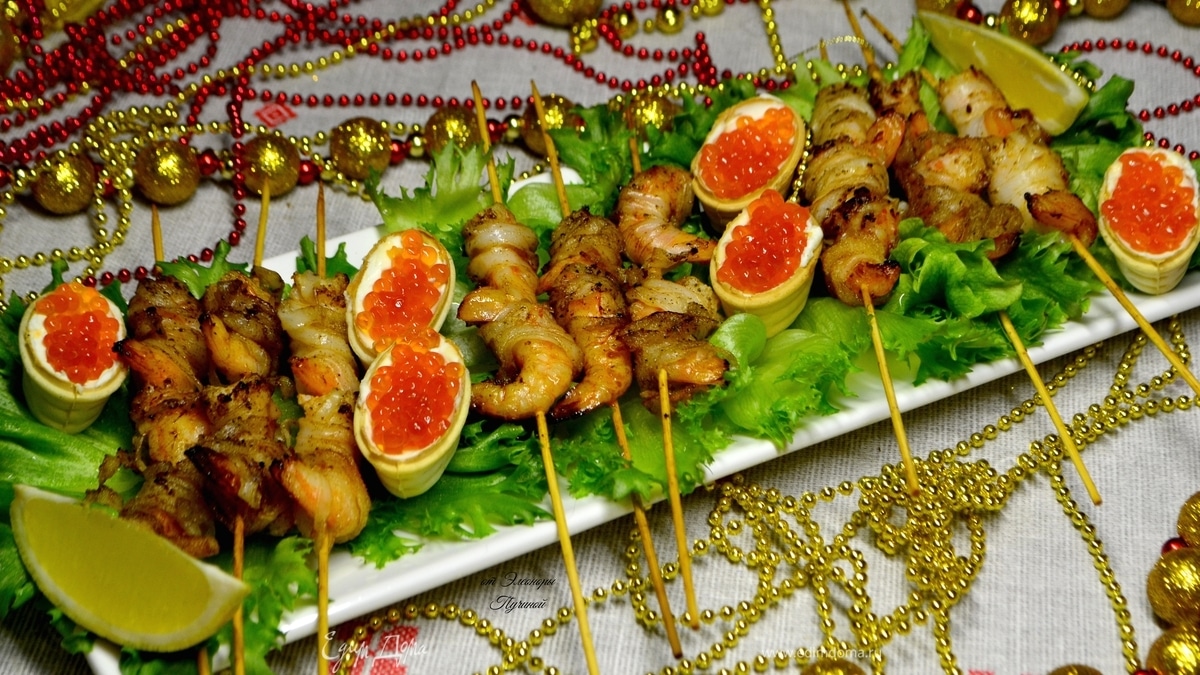 Большое блюдо украсить листьями салата, креветки на шпажках выложить на листья, рядом положить тарталетки, наполненные маскарпоне и красной икрой, и дольки лимона. Соком лимона сбрызнуть креветки. Вкусная праздничная закуска готова! - Шаг 6