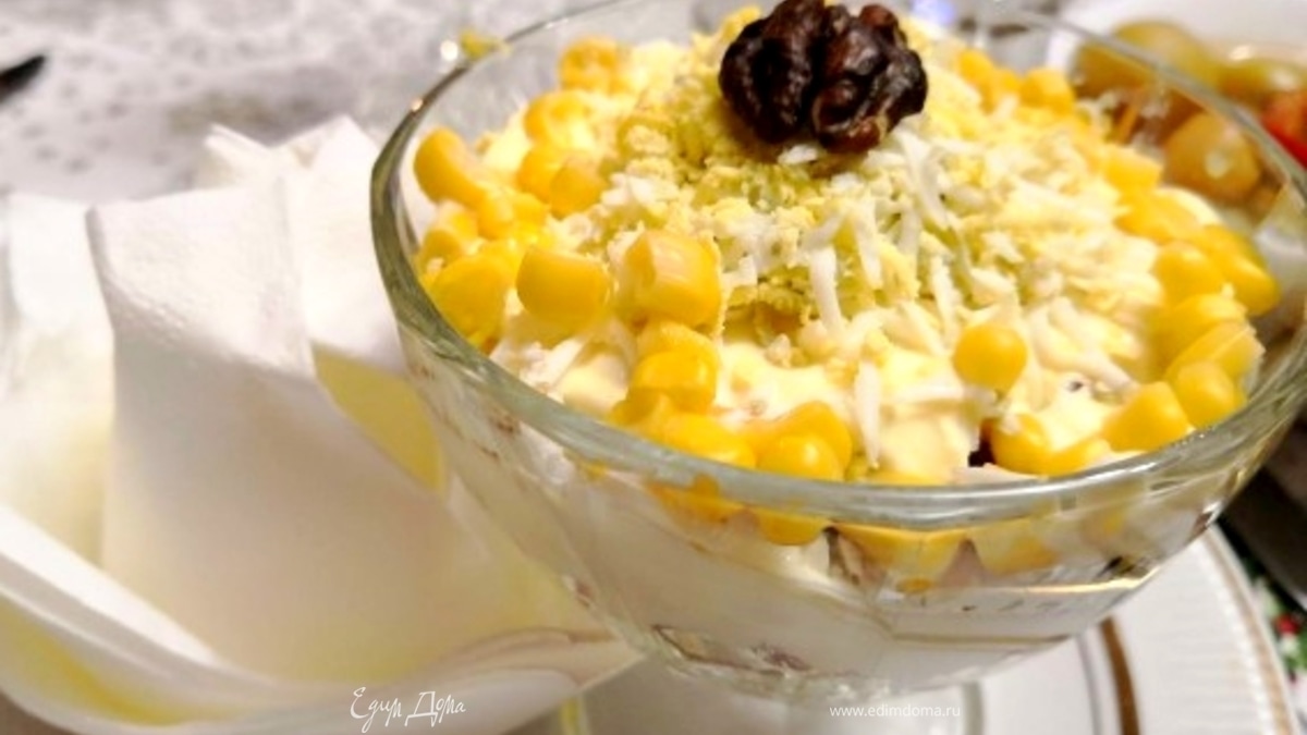 Девятый слой — майонез. Десятый слой — тертое яйцо. Украсить салат по кругу кукурузой и грецким орехом. - Шаг 7