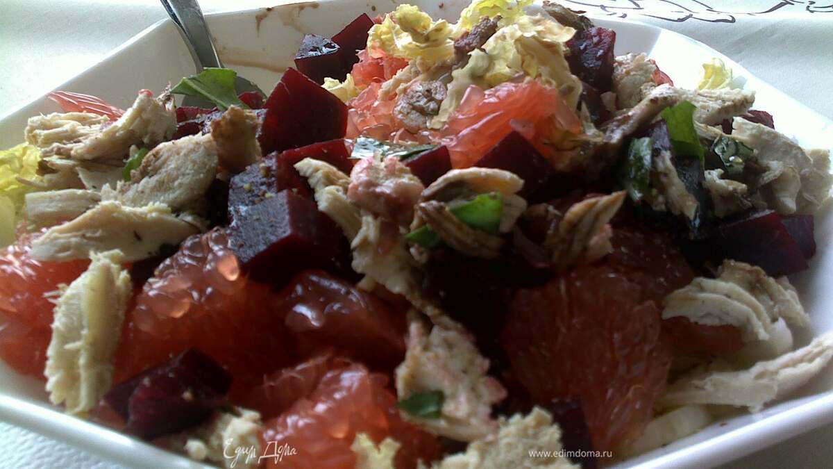 - Шаг 1На вымытые и просушенные листья салата выложить нарезанную кубиками вареную свеклу, затем очищенные дольки грейпфрута и разобранную на волокна куриную грудку. Смешать в отдельной посуде оливковое масло, бальзамический уксус, соль и молотый перец. Полить этой заправкой салат и тут же подавать.