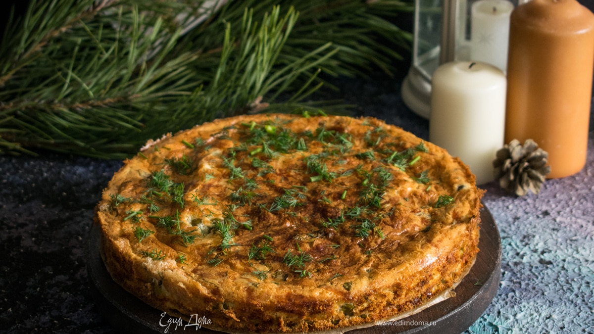 Пирог остудить в форме. Пройтись тонким ножом вдоль бортиков и снять их. Посыпать рубленой зеленью. Приятного аппетита!