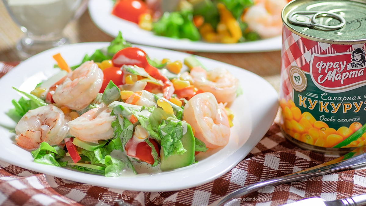 Салат с кукурузой и креветками под заправкой «Цезарь»
