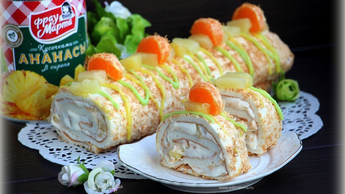 Сливки взбить с сахарной пудрой и выложить на остывший корж. Сверху выложить кусочки ананасов ТМ «Фрау Марта» — они придадут нашему десерту необыкновенный освежающий вкус. Свернуть в рулет. Можно полить глазурью и украсить ананасами и мандаринами.
