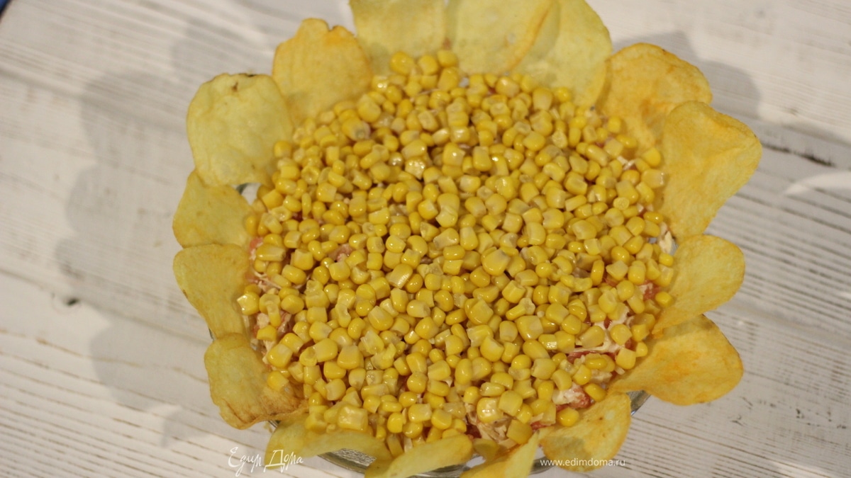 Выкладываем салат в блюдо и украшаем его кукурузой ТМ «Фрау Марта» (кукуруза будет заменять нам семечки подсолнуха), а с краев украшаем чипсами, как будто лепестками. Салат готов. Осталось лишь немного дать ему пропитаться, и можно подавать на стол!